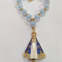 Dezena para Carro bolinha 10 mm com entremeio de N. Sra. Aparecida dourada com strass. Fecho dourado fácil de abrir e fechar. Dezena com pompom. Comprimento da dezena: 26 cm. Venda por unidade. Embalagem plástica.